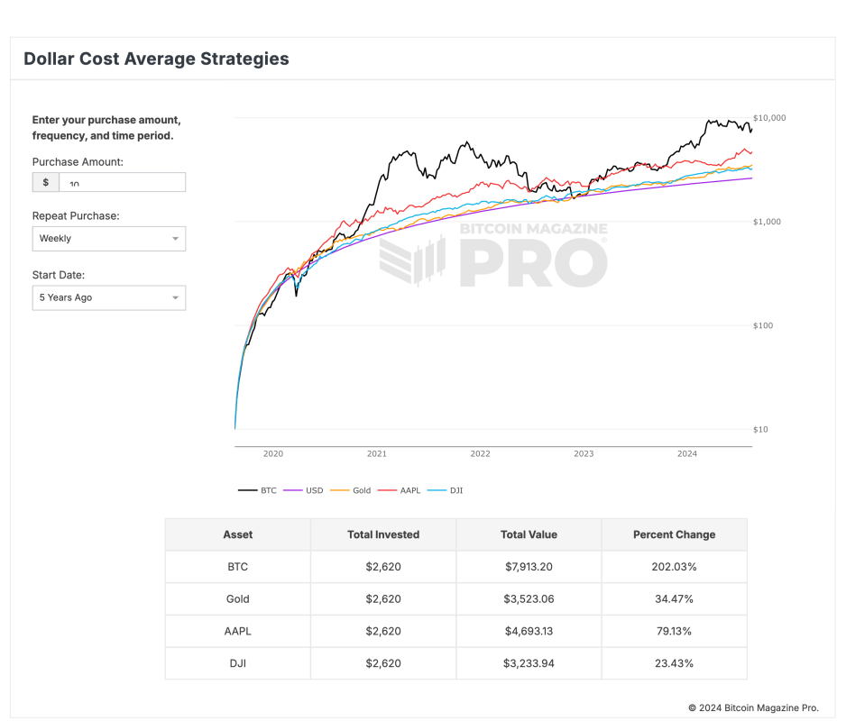 A recent analysis from Bitcoin Magazine Pro showcases the power of dollar-cost averaging (DCA) in Bitcoin compared to traditional assets like gold, Apple stock, and the Dow Jones Industrial Average (DJI). The data reveals that consistently investing $10 weekly into Bitcoin over the last five years would have grown a total investment of $2,620 into $7,913.20, reflecting a remarkable 202.03% return.
